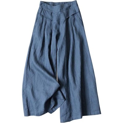 Women' s Culottes Linen Blend Wide Leg Pants Elastic Waist Casual Palazzo Trousers with Pockets Capris