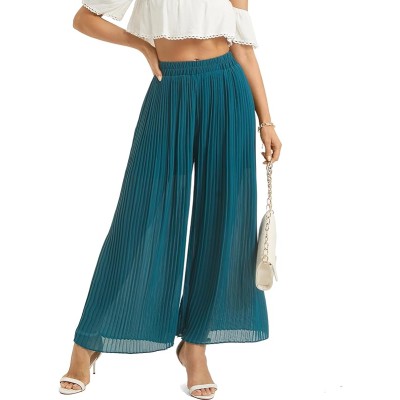 Women's Wide Leg Dress Pant High Waist Casual Flowy Boho Trousers Pleated Chiffon Elastic Waist Pants