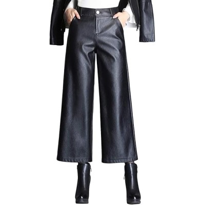 Women's High Waist Wide Leg PU Faux Leather Cropped Pants Culottes