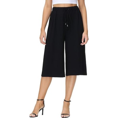 Women's Elastic Waist Wide Leg Casual Palazzo Capri Culottes Pants Soft Knit Cropped Pants