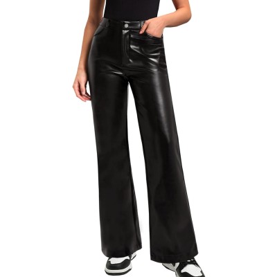Black Faux Leather Pants for Women High Waisted Flare Leggings Straight Wide Leg Pleather Pants with Pockets